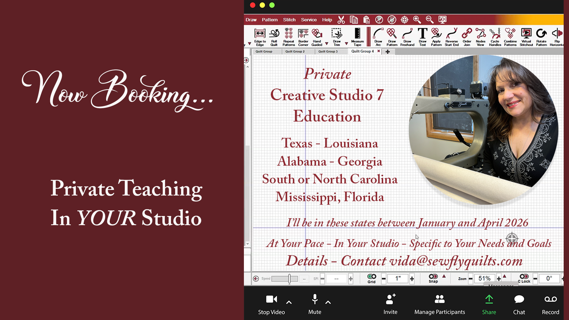 Ready to take your Creative Studio skills to the next level? Vida teaches privately as well as online via Zoom and recorded lessons. As a longarm educator, Vida can develop a class just for you based on your needs and level of experience.